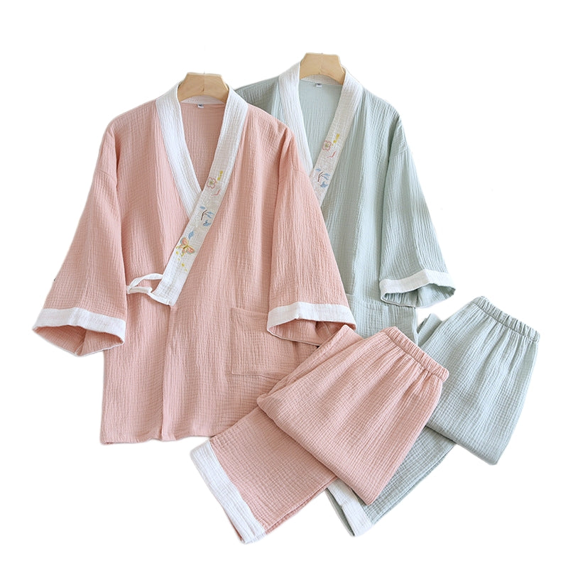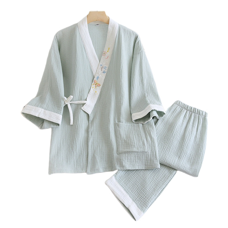 Crafted from premium cotton crepe, these pajamas provide breathable comfort in soothing, soft hues. The exquisitely decorated collar, showcasing intricate flower and butterfly embroidery, adds a whimsical touch.