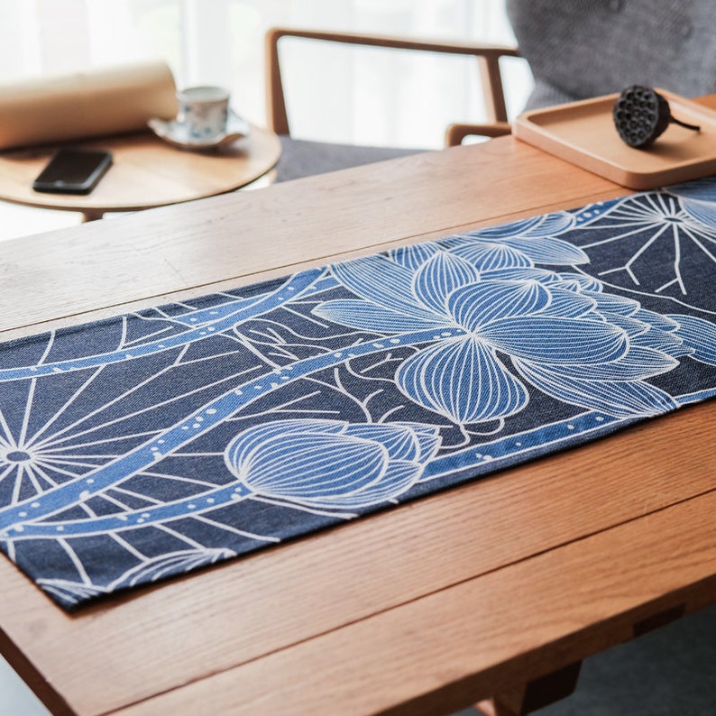 This blue Japanese table runner add a quick splash of color and pattern to your dining table. The table runner is made of our durable, semi-waterproof linen and features a blue lotus art print. This will also make a perfect gift for your loved ones for Housewarming, Thanksgiving or Christmas.